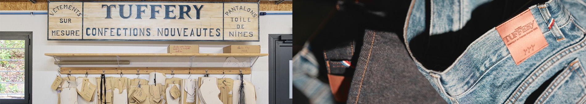 Atelier TUFFERY conçoit ses collections depuis 130 ans, faisant de lui le plus ancien fabricant de jeans français. Avec un souci d’authenticité intact, une volonté d’élégance et de sobriété, Atelier TUFFERY perpétue ce savoir-faire en continuant de revisiter et de confectionner les modèles mythiques de la maison, qui font encore aujourd’hui sa renommée. C’est au cœur de la Lozère, au pied des colosses minéraux des Cévennes, que la manufacture, pionnière du jean français, conçoit de nouvelles créations, aux coupes contemporaines, adaptées au vestiaire quotidien, comme aux exigences des artisans et travailleurs d’aujourd’hui.